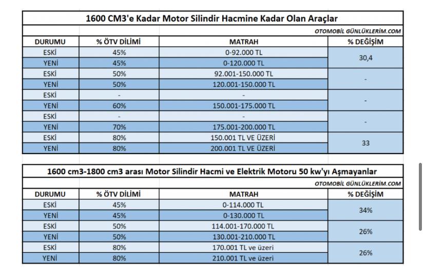 Ayrıca 1600 cm3-1800 cm3 arası Motor Silindir Hacmi ve Elektrik Motoru 50 kw’yı aşmayan araçların yüzde 45 ÖTV dilimindeki matrah limiti 114 bin TL’den 130 bin TL’ye çıkarıldı.