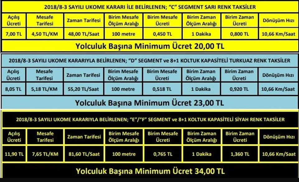 Ayrıca açılışı 11.90 TL olan siyah taksilerin kilometre başına ücreti 7.65 TL. Üstelik Siyah taksilerde mininum ücret ise 34 lira.